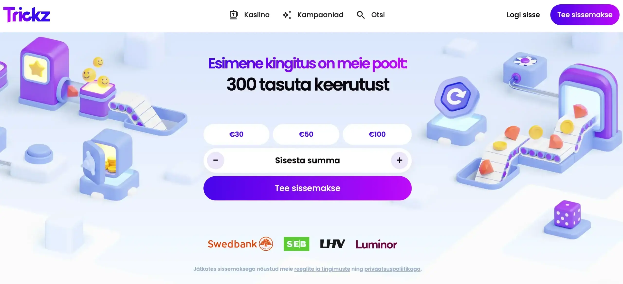 Trickz kasiino teeb sissemaksete tegemise lihtsaks, kiireks ja turvaliseks. Kuna tegemist on kontovaba platvormiga, ei ole vaja kasutajakonto loomist ega pikki registreerimisvorme. Sissemakse ja konto aktiveerimine toimuvad korraga, kasutades Euroopa usaldusväärset makseteenust Trustly. Trickz casino toetab kõiki suuremaid Eesti panku, sealhulgas Swedbanki, SEB-d, LHV-d ja Luminorit. Kõik maksed jõuavad mängijakontole koheselt ning protsess kestab vaid mõne sekundi.